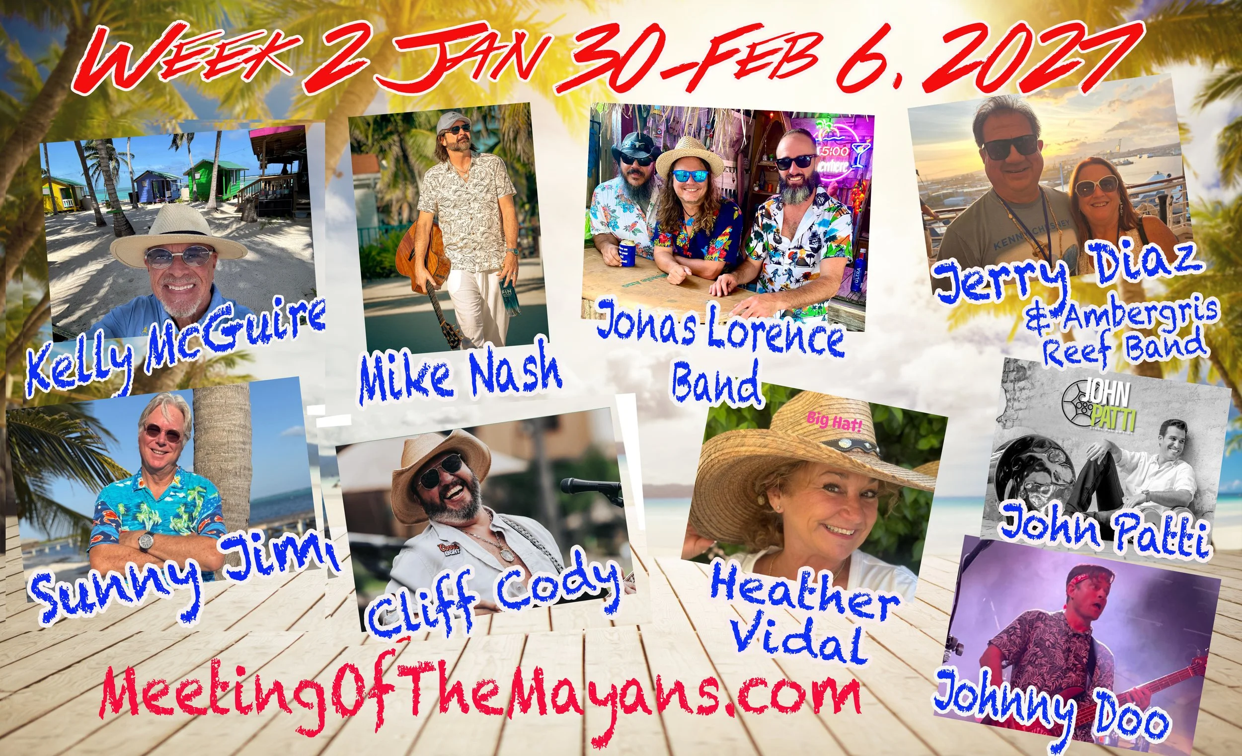 Saturday night we’ll get the party started on the main stage with a fun filled night of high energy, full band music. We’re honored to have Jerry Diaz officially joining the party in 2027 and we’ve put together an “Ambergris Reef Band” to back him up and get our week 2 off to a proper start. “The Godfather of Trop Rock” will be followed by first time Mayans- Jonas Lorence Band -who’ll definitely be keeping us dancing all night! Jonas and the boys are coming all the way from Austin Texas this year to help keep the island rockin’ all week long. Get on your dancing shoes and get ready to hit the ground running this year for week 2…we’ve gotta “keep the party going” after all!